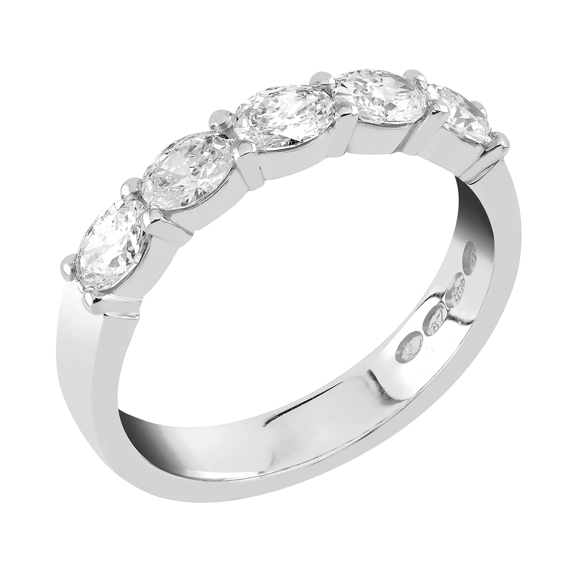 Näyttävän Yöpilvi M-440w sormuksen rivissä on 5 kpl ovaalihiontaisia timantteja kauniissa 4-kyntisissä istutuksissa. Yksittäisen timantin mitat ovat noin 4 x 3 mm.