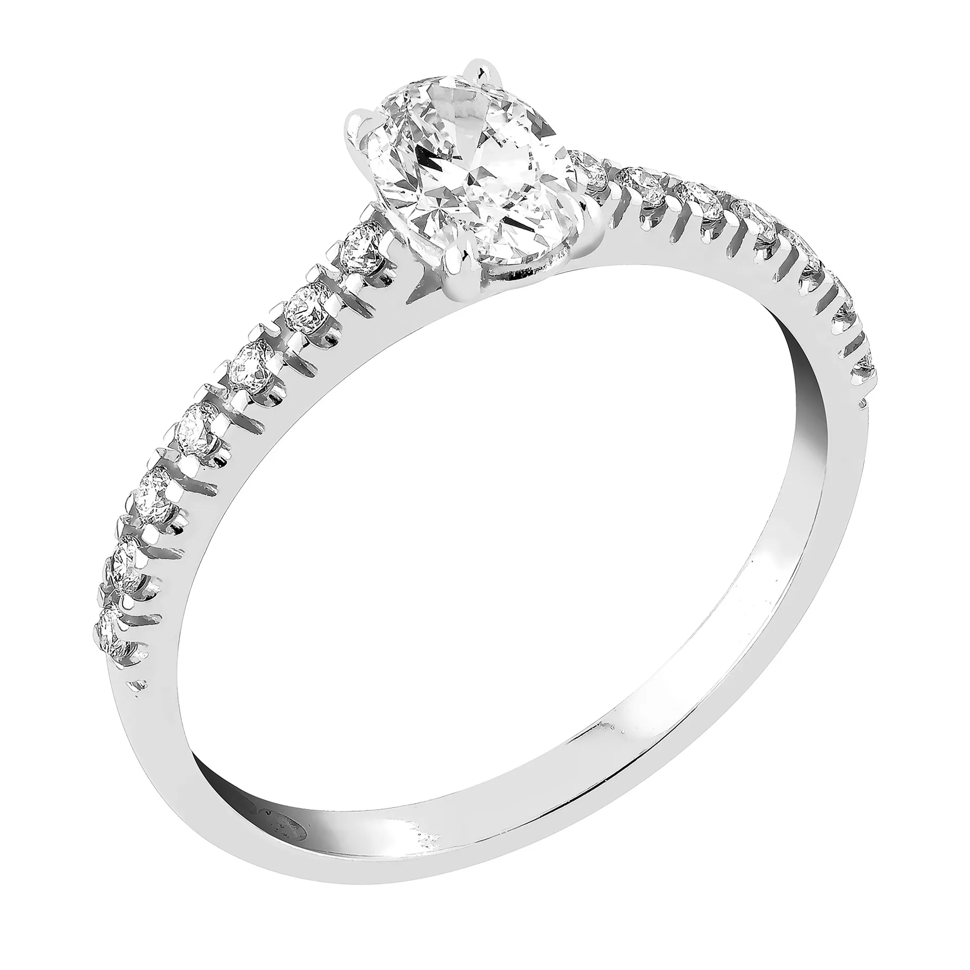 Taivaanranta M-445w-sormuksen keskikiven 4-kyntiseen istutukseen sopii 0,50–0,55 ct ovaalihiontainen timantti (kuvassa 0,50 ct).